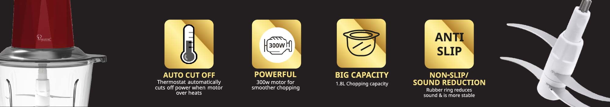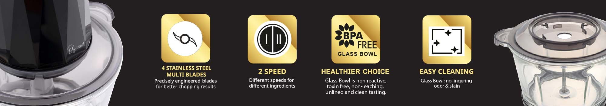 Special Features of Our Glass Food Chopper: BPA-free glass container, 2-speed, over-heat protection