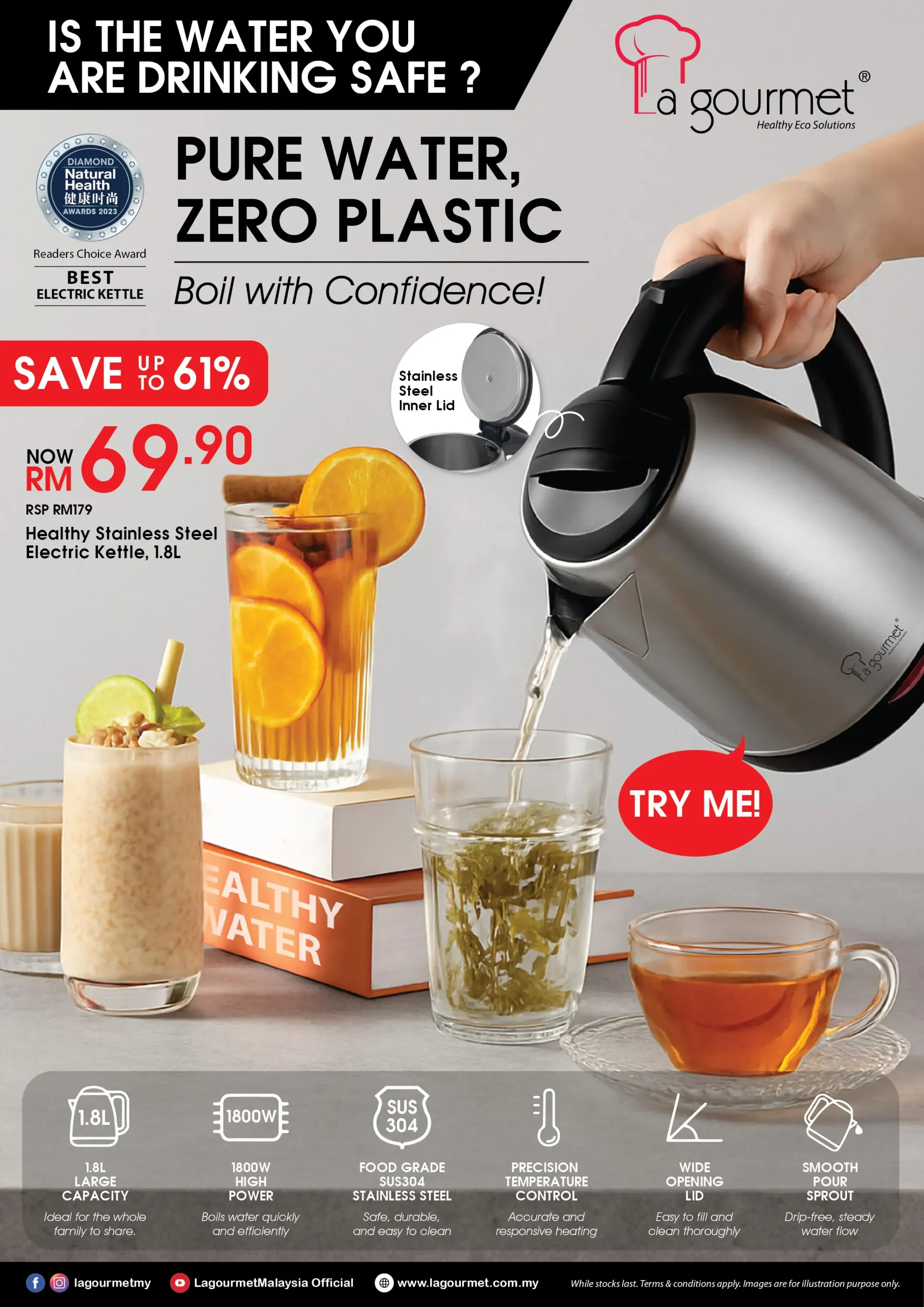 Healthy Electric 1.8L Stainless Steel Kettle