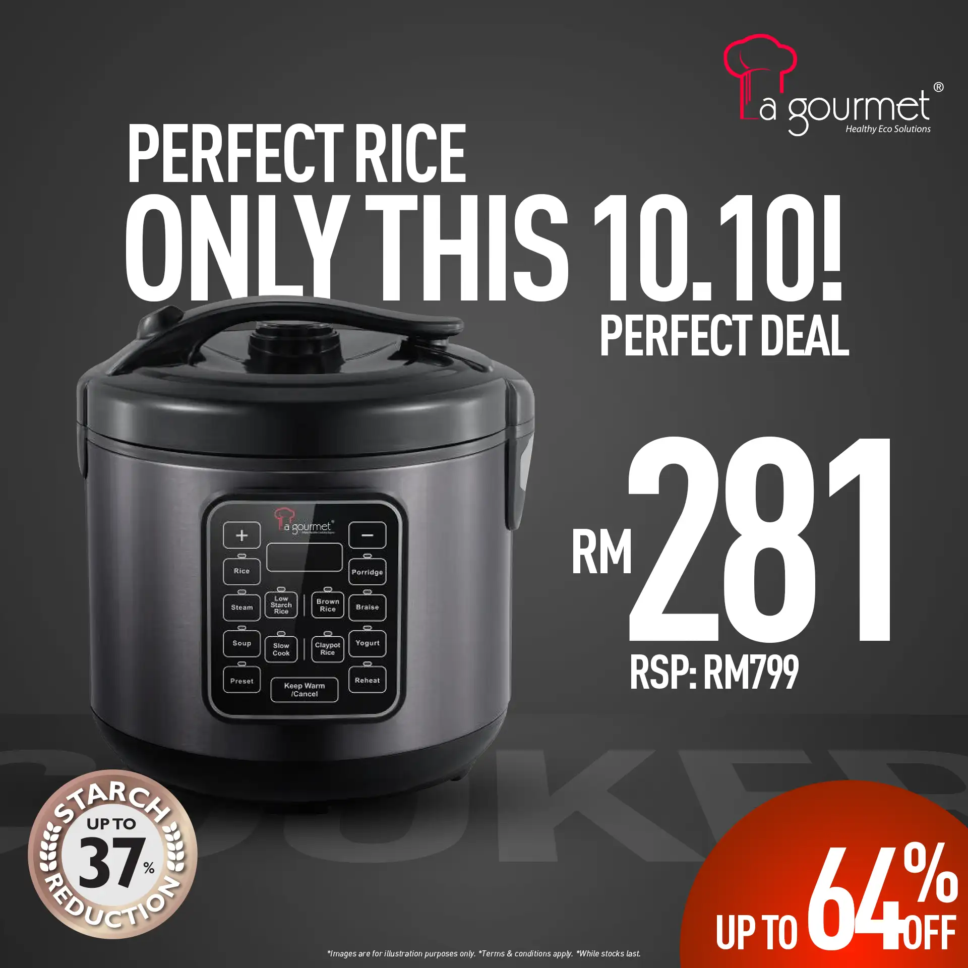 Unique 4-step low starch cooking, easy preset program, large capacity