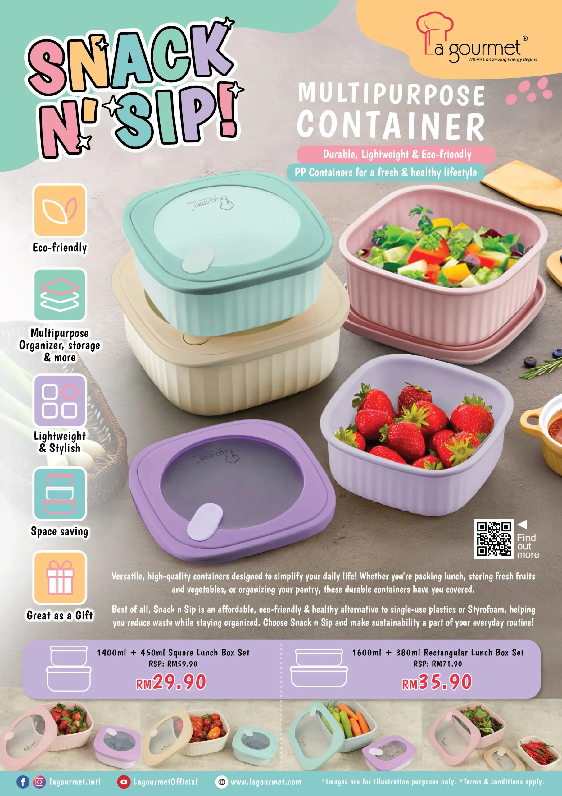Snack N’ Sip 2 Pieces Rectangular Container Set – Pink/cream